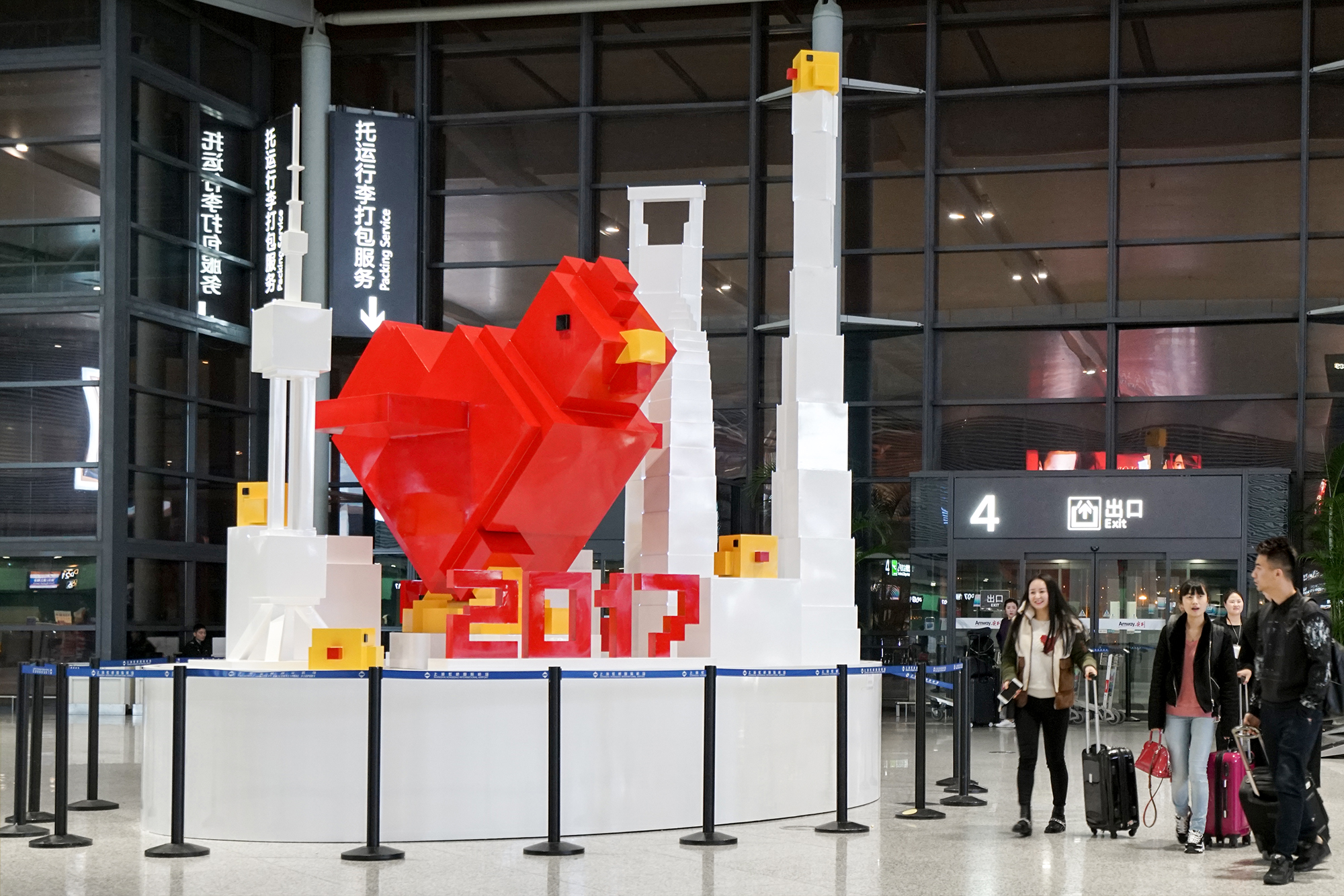 在上海虹橋國際機(jī)場2號航站樓出發(fā)及到達(dá)大廳,一組由上海機(jī)場德高動(dòng)量廣告有限公司策劃的方塊像素丁酉年“飛雞”藝術(shù)雕塑群吸引了很多人的目光。兩組藝術(shù)雕塑群分別位于到達(dá)大廳行李提取處南北兩側(cè),可愛的“飛雞爸爸”和“小黃雞寶寶們”的家庭組合,令每一位在春運(yùn)期間抵達(dá)虹橋機(jī)場的乘客都能感受到新年氛圍和回家的溫馨,活潑伶俐地展現(xiàn)了酉雞年新春主題。(美通社,2017年1月16日上海)