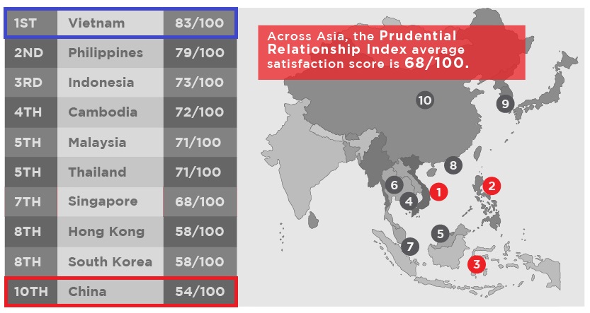 保誠保險公布的2016年保誠人際關系指數顯示,亞洲人對人際關系的總體滿意度較高,為68%。亞洲十個國家和地區中,越南受訪者對人際關系的滿意度最高,為83分,其次分別是菲律賓和印度尼西亞。中國得分最低,僅54分。另外,人們最容易因金錢、孩子以及缺乏關注等問題產生爭執。(美通社,2017年2月9日香港)