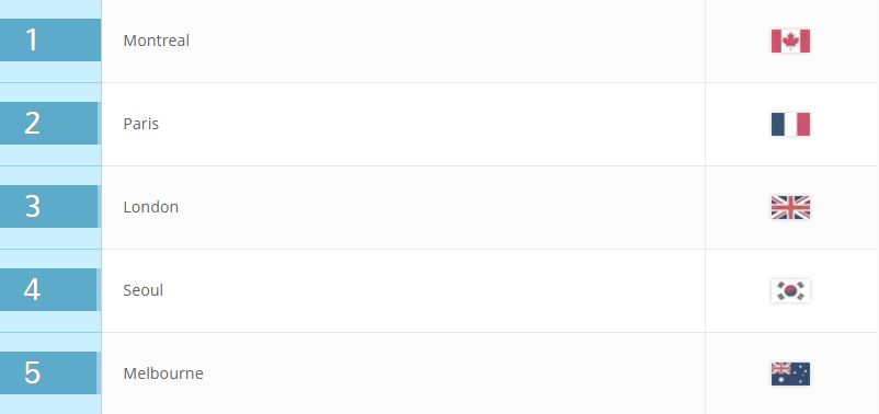 2017 QS最佳大學城市排名發布,加拿大蒙特利爾從去年的第七位升至第一,終結巴黎的五連冠。巴黎掉至第二位,主要是因為在支付能力和向往度兩方面得分下降。倫敦由去年的第五名上升至第三,去年第十名的首爾升至第四,而墨爾本則由去年的第二跌至第五。中國最好成績是排在第11位的香港,上海和北京分列第25和30名。(美通社,2017年2月15日倫敦)