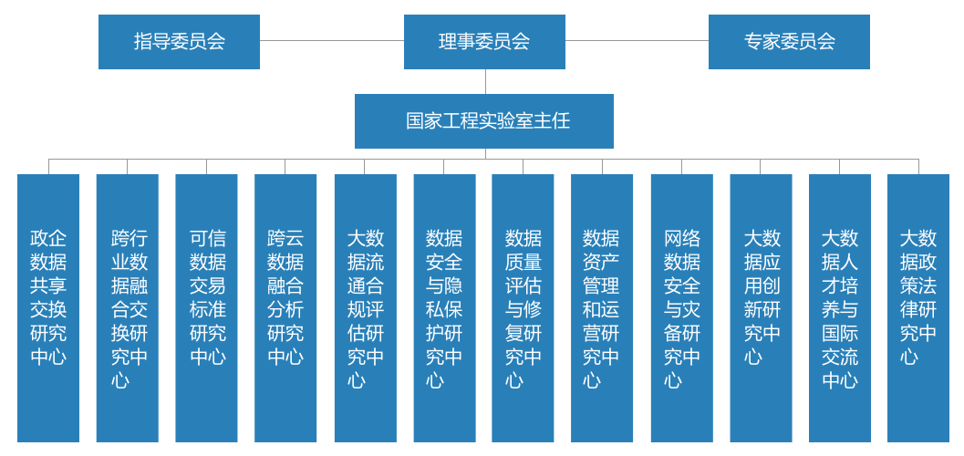 大數據流通與交易技術國家工程實驗室設“三會一主任+研究中心”。由“三會”協同領導推進實驗室發展,設指導委員會,理事委員會,第一屆專家委員會。由實驗室主任負責統籌指導實驗室建設。由“研究中心”負責推進具體研究方向的研發,首批建設十二個研究中心,包括:政企數據共享交換研究中心,跨云數據融合分析研究中心等。(美通社,2017年2月21日上海)