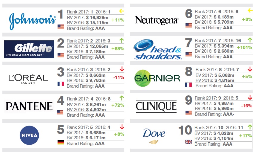 英國知名品牌評估機構 Brand Finance 近日公布 2017年“全球最有價值 50大美妝品牌”榜單。強生消費品集團旗下品牌強生(Johnson’s)超越連續三年蟬聯榜首的法國美妝巨頭歐萊雅集團旗下品牌巴黎歐萊雅(L’Oreal Paris),以168.29億美元,名列第一位。名列第二位的吉列(Gillette)品牌價值為120.65億美元。巴黎歐萊雅(L'Oreal Paris)品牌價值下滑至86.62億美元,名列第三位。在50強品牌中出現最多的還是歐萊雅集團、寶潔集團、強生集團和聯合利華集團旗下的品牌。強生消費品集團此次表現出強勁的實力,有6個品牌上榜。(美通社,2017年5月11日上海)