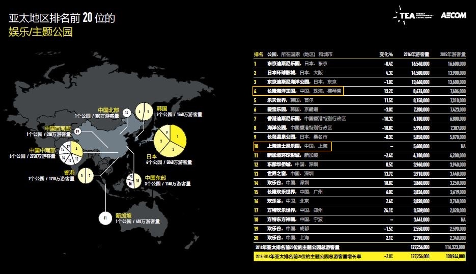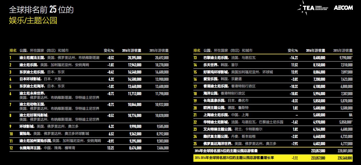 由主題娛樂協(xié)會(Themed Entertainment Association,簡稱“TEA”)與AECOM聯(lián)合推出的《2016主題公園報告和博物館報告》正式出版。報告顯示,盡管去年世界排名前25名的主題公園游客總量略降1.1%,但排名最前的10大主題公園運營商旗下的公園游客量卻增長4.3%,從4.2億人次增長至4.38億人次。
