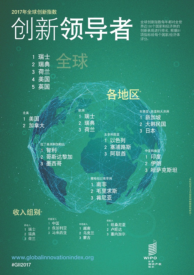 由康奈爾大學、英士國際商學院(INSEAD)和世界知識產權組織(產權組織)合編的2017年全球創(chuàng)新指數(shù)顯示,瑞士、瑞典、荷蘭、美國和英國是世界上最具創(chuàng)新力的國家,而包括印度、肯尼亞和越南在內的若干國家的表現(xiàn)則優(yōu)于發(fā)展水平相當?shù)耐瑑?/strong>。2017年,瑞士連續(xù)第七年位列榜首,除排名第22位的中國之外,前25名中的24個都是高收入經濟體。2016年,中國首次成為進入前25名的中等收入經濟體。亞太地區(qū),排在中國之前的經濟體分別是新加坡(全球第7),韓國(全球第11),日本(全球第14),和香港(全球第16)。(美通社,2017年6月15日日內瓦)
