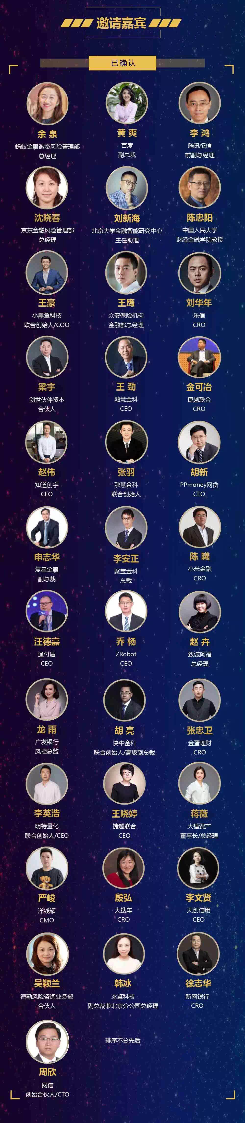屆時,幾十位金融界大咖將出席活動。如融慧金科CEO王勁;知道創宇CEO趙偉;融慧金科聯合創始人張羽;小米金融CRO、信貸業務負責人陳曦;捷越聯合創始人、快催收創始人王曉婷;明特量化聯合創始人、CEO李英浩;ZRobot CEO喬楊;致誠阿福總經理趙卉;PPmoney網貸CEO胡新;創世伙伴資本合伙人梁宇;通付盾CEO汪德嘉;聚寶金科總裁李安正;大錘資產董事長、總經理蔣薇;冰鑒科技副總裁韓冰;捷越聯合CRO金可冶;快牛金科聯合創始人、高級副總裁胡亮;廣發銀行風控總監龍雨;金蛋理財CRO張忠衛;小黑魚科技聯合創始人、COO王豪;眾安保險機構金融部總經理王鷹;樂信CRO劉華年;復星金服副總裁申志華;大搜車CRO殷弘;洋錢罐CMO嚴峻;天創信用CEO李文賢;新網銀行CRO徐志華;世界銀行集團IFC特聘專家丁宇;德勤風險咨詢業務部合伙人吳穎蘭;網信創始合伙人、CTO周欣、麥子金服副總裁兼首席風控官李曉忠等。
