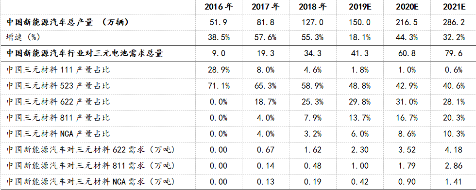 表:2016-2021年鋰離子電池對三元材料的需求量