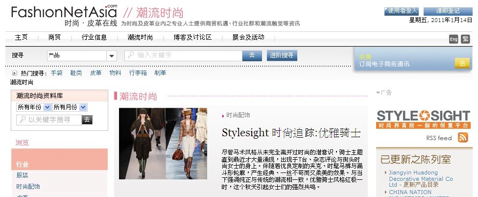 香港2011年1月17日電 /美通社亞洲/ -- FashionNetAsia (www.FashionNetAsia.com) 今日宣布將與Stylesight (www.stylesight.com/) 合作,在FashionNetAsia的“潮流時尚”欄目定期刊登由Stylesight時尚專家撰寫的全球時尚潮流分析及預測報告等。報告內容將集中于FashionNetAsia供應商的產品類別如鞋類、手袋配飾等。