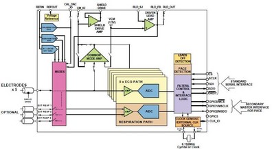 ADAS1000 的其它主要特性和優勢包括:直流耦合通道方案具有簡化輸入切換、增加功能、降低功耗和獨特的后處理優勢;5個 ECG 電極測量的工作功耗僅19mW,可以方便地禁用任何不用的通道或特性,使一個導聯的較低功耗僅11mW;低噪聲性能(0.05 Hz至150 Hz范圍內10 µV峰峰值)支持終端設備監管標準;提供不同的數據幀速率(2kHz、16kHz、128kHz),較大程度地簡化數據采集任務;能夠簡化整體設計,去除許多分立器件,并縮減系統整體尺寸、降低功耗、縮短開發時間。該器件還集成了起搏器脈搏檢測和呼吸測量功能,這些特性對于高性能 ECG 系統至關重要。