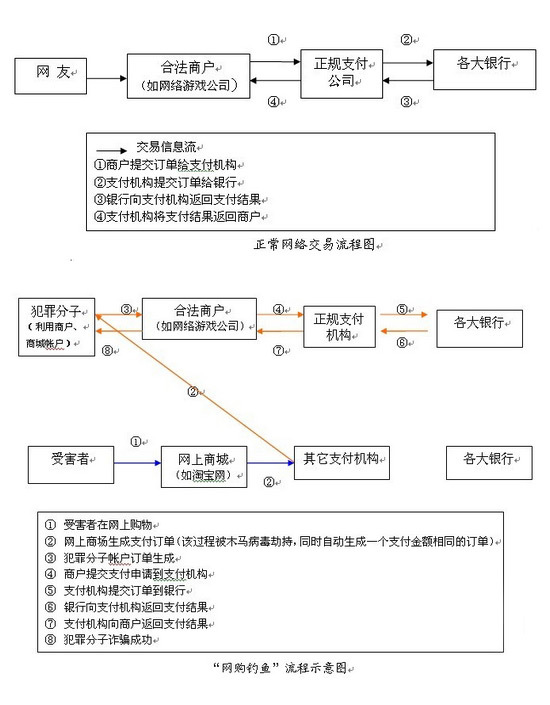 示意圖如上(如圖所示,“正規支付機構”兩端的流程都是正常流程,無法分辨是騙子還是受害者;但“網上商城”、“合法商戶”有責任追索到騙子):