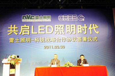 中國惠州2011年3月31日電 /美通社亞洲/ -- 國際知名專業照明企業雷士照明(香港主板上市代號:2222)與全球LED 照明領域的行業領先者科銳公司(Nasdaq: CREE) 在上海簽署戰略合作協議,進行強強聯合,全面推動半導體照明產業的發展與變革。