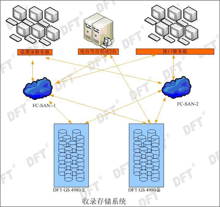 信息中心林主任表示:“在大樓建設初期,收錄系統中的數據都存儲在工作站中,安全問題存在很大隱患性,任何一臺服務器宕機,系統都將面臨數據全部丟失的風險。如何確保數據安全,成為新系統建設初期迫在眉睫需要解決的問題。根據客戶的特別要求,DFT 在其存儲解決方案中,存儲架構采用全冗余設計,通過主備交換機,將數據存儲到DFT磁盤陣列中,保證了鏈路和數據的安全性。目前 DFT 存儲產品可以滿足收錄系統的需求,并且在帶寬上還略有余量。”同時該存儲方案中又采用了 DFT GS 系列高端存儲產品,提供了滿足用戶需求的存儲帶寬,保障了存儲系統的穩定性,提高了存儲系統高可用性。由于該產品還支持高達224TB 的存儲容量,為日后系統中增加節目提供了足夠的存儲空間,為整個收錄系統的穩定運行提供了堅實的基礎。