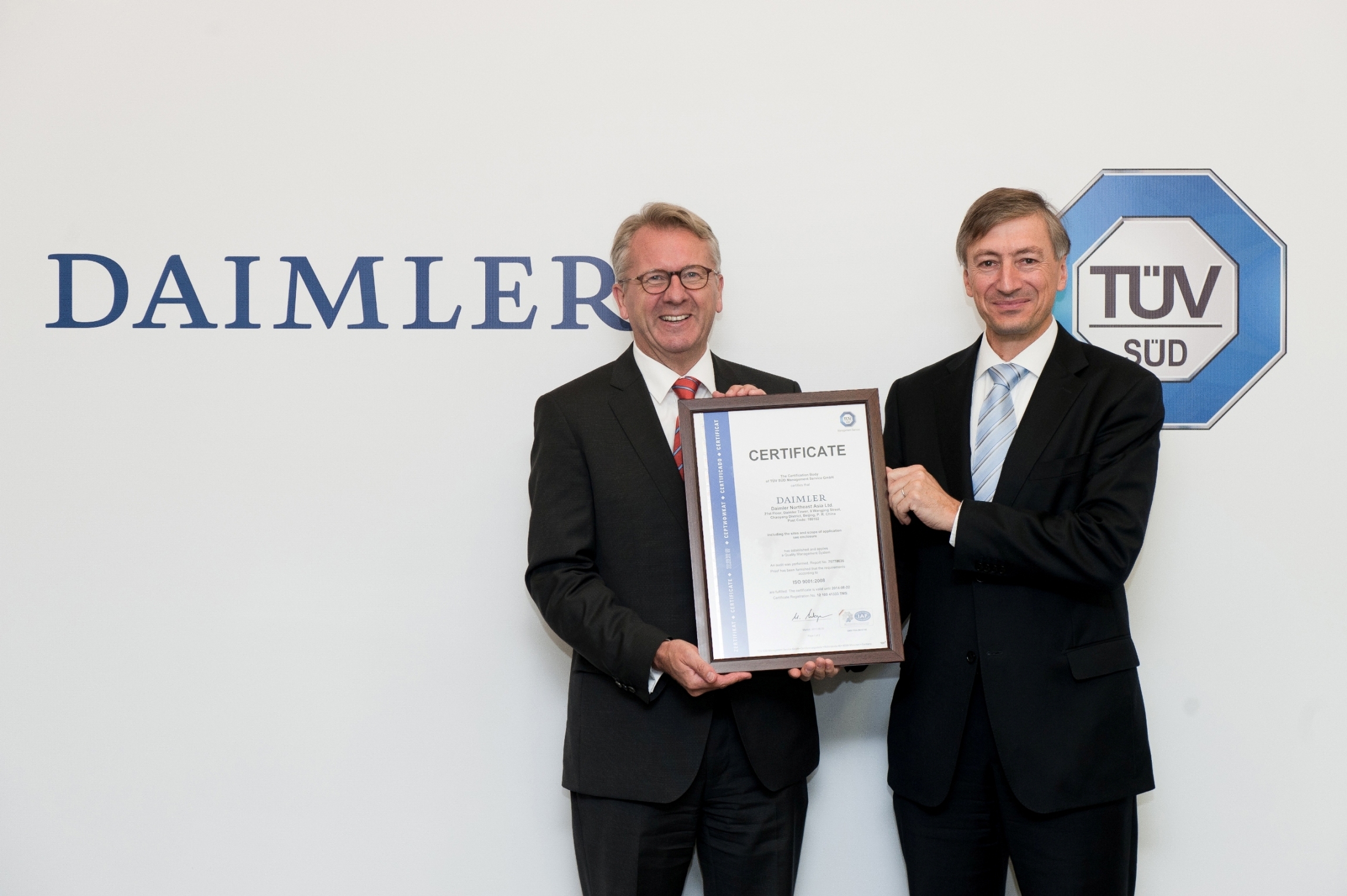 TUV SUD 管理服務股份有限公司(TUV SUD Management Service GmbH) CEO:Peter Schaff 博士(右)向戴姆勒東北亞投資有限公司董事長兼首席執行官華立新(Ulrich Walker)先生(左)頒發證書