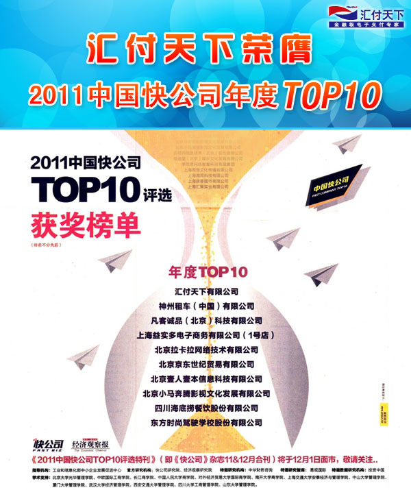 上海2011年10月25日電 /美通社亞洲/ -- 由《快公司》和《經(jīng)濟(jì)觀察報》聯(lián)合主辦的“2011中國快公司 TOP10 評選”結(jié)果于10月24日揭曉,匯付天下有限公司(以下簡稱“匯付天下”)在288家優(yōu)秀企業(yè)中脫穎而出,獲得“2011中國快公司年度 TOP10”榮譽(yù)。