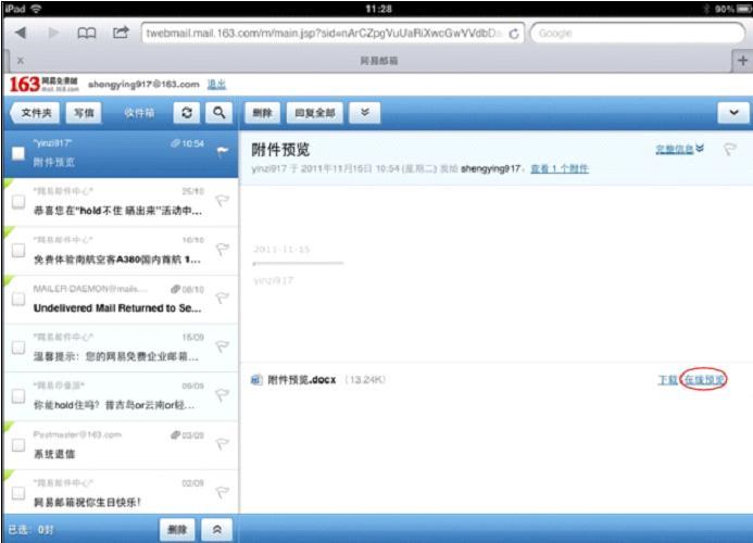 北京2011年11月30日電 /美通社亞洲/ -- 中國第一大電子郵箱服務商網(wǎng)易近日宣布,在安卓手機、蘋果手機和 iPad 上使用網(wǎng)易郵箱的用戶,可在線預覽各種格式的郵件附件,瀏覽體驗和 PC 一樣,此舉為國內首家。