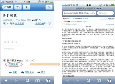 據(jù)網(wǎng)易郵箱產品經理介紹,對于網(wǎng)易郵箱(163.com、126.com、yeah.net)的4.3億用戶,只要通過 IMAP 方式收取網(wǎng)易郵箱附件,不管是否安裝任何打開附件的軟件,都可以在手機和 ipad 等終端(包括 PC 客戶端、Android 手機端、iPhone 端、iPad 端的用戶)上在線預覽附件,不占用各手機和 iPad 的空間,這在國內郵箱運營商中屬于首創(chuàng)。