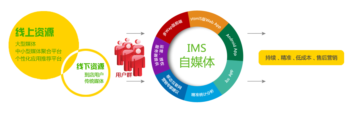 IMS系統的優勢在于,其首先能給企業增加新用戶的上游資源引入,并能將引入資源轉化為會員,繼而進行持續、精準、低成本的企業“自媒體”平臺營銷;同時,該系統還能提供專業的托管、運營、統計報告、專業營銷指導等服務,為企業提供一套上中下游整體營銷服務體系
