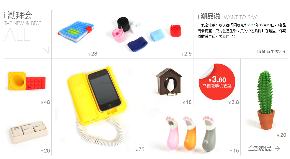 北京2011年12月26日電 /美通社亞洲/ -- 誰說實用的東西一定不好看不好玩?中國領先的個性印品平臺網易印像派熱力推出全新創意雜物頻道 -- “I 潮品”http://yxp.163.com/iwave/index/)。該頻道網羅全球各地最有意思的“創意潮流雜物”,為用戶打造一個包括生活、學習、搞怪和出行四個維度的趣味、實用、極具設計感的“小東西”購物平臺。“I 潮品”頻道是網易印像派“無設計,不生活”品牌理念的進一步詮釋,豐富了網易印像派消費者的選擇。