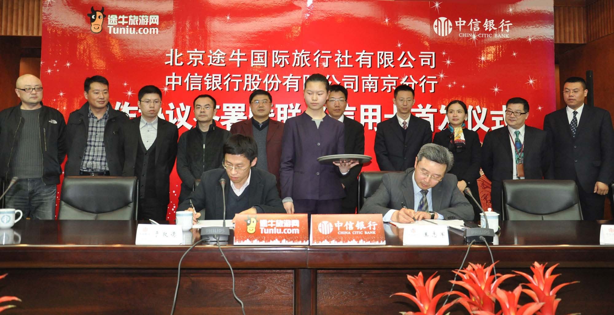 北京和上海2012年3月22日電 /美通社亞洲/ -- 2012年3月20日,“途牛旅游網聯合中信銀行 合作協議簽署暨聯名信用卡首發儀式”隆重舉行,途牛旅游網 CEO 于敦德、中信銀行南京分行副行長王志軍、中信銀行信用卡中心副總裁王寧橋出席了本次活動并作發言。