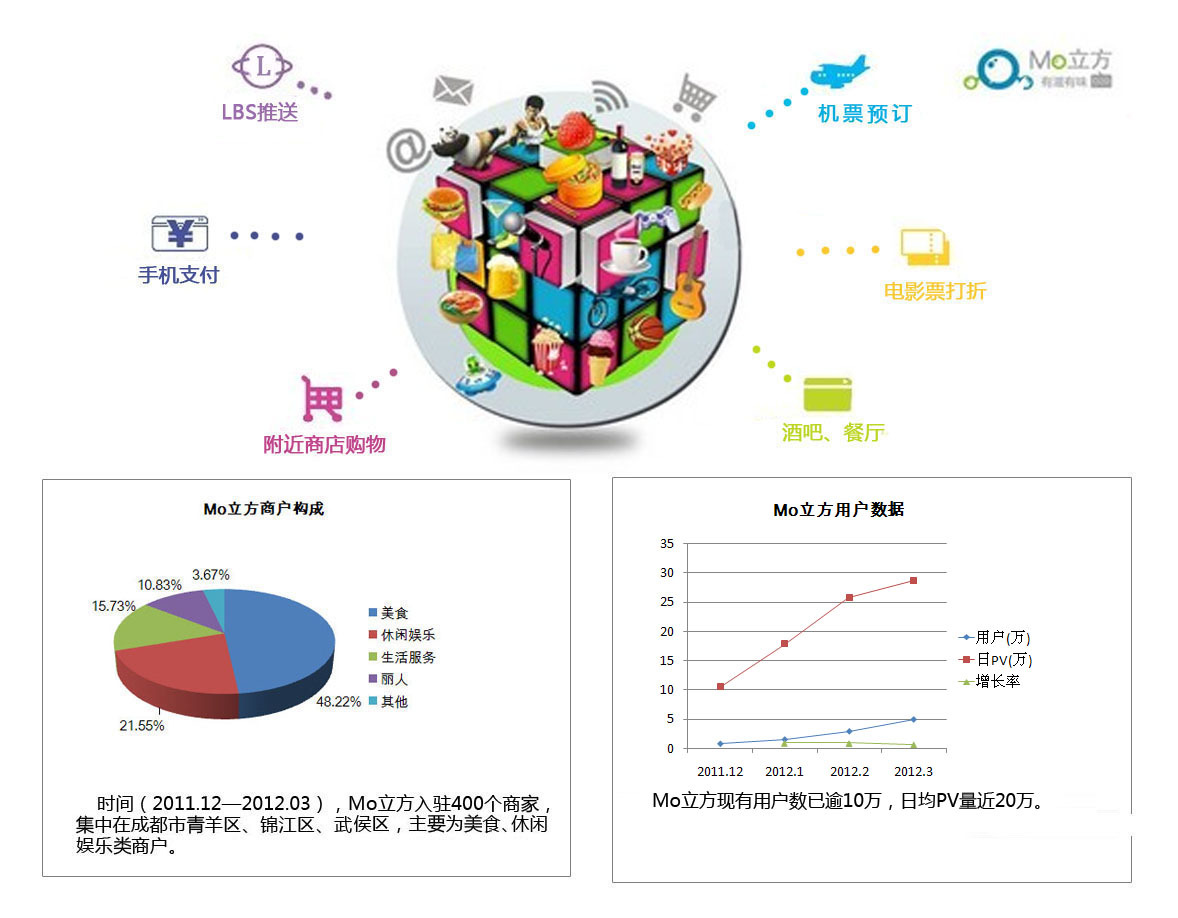 2012年1月,Mo立方與騰訊大成社區愛吃團聯手舉辦的“愛吃團&Mo立方新年送福利”活動,短短半個月時間,參與人數接近10萬,回復熱貼超過5000,活動非常火爆。隨后,本地的大型商戶如一點味、吳銘火鍋、碎蝶咖啡等也陸續與Mo立方開展活動。與此同時,Mo立方的影響力也吸引了銀行和同行業的關注,已有不少公司在尋求洽談合作。