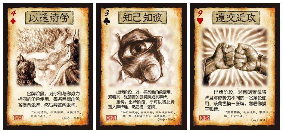 由此可見,《三國殺·國戰(zhàn)》以桌游的方式演繹了在一場多方勢力混雜的戰(zhàn)爭。用【以逸待勞】保存、提高自己的實(shí)力。用【知己知彼】一探身邊的神秘人物是敵是友、甚至摸清底細(xì)。用【遠(yuǎn)交近攻】團(tuán)結(jié)身邊的敵人,把他的優(yōu)勢變成自己的武器,去消滅那些容易消滅的敵人。而每一支錦囊何時出現(xiàn)、如何使用的安排、謀劃,會具有什么樣的威力、效果,就要看玩家的運(yùn)籌帷幄了。