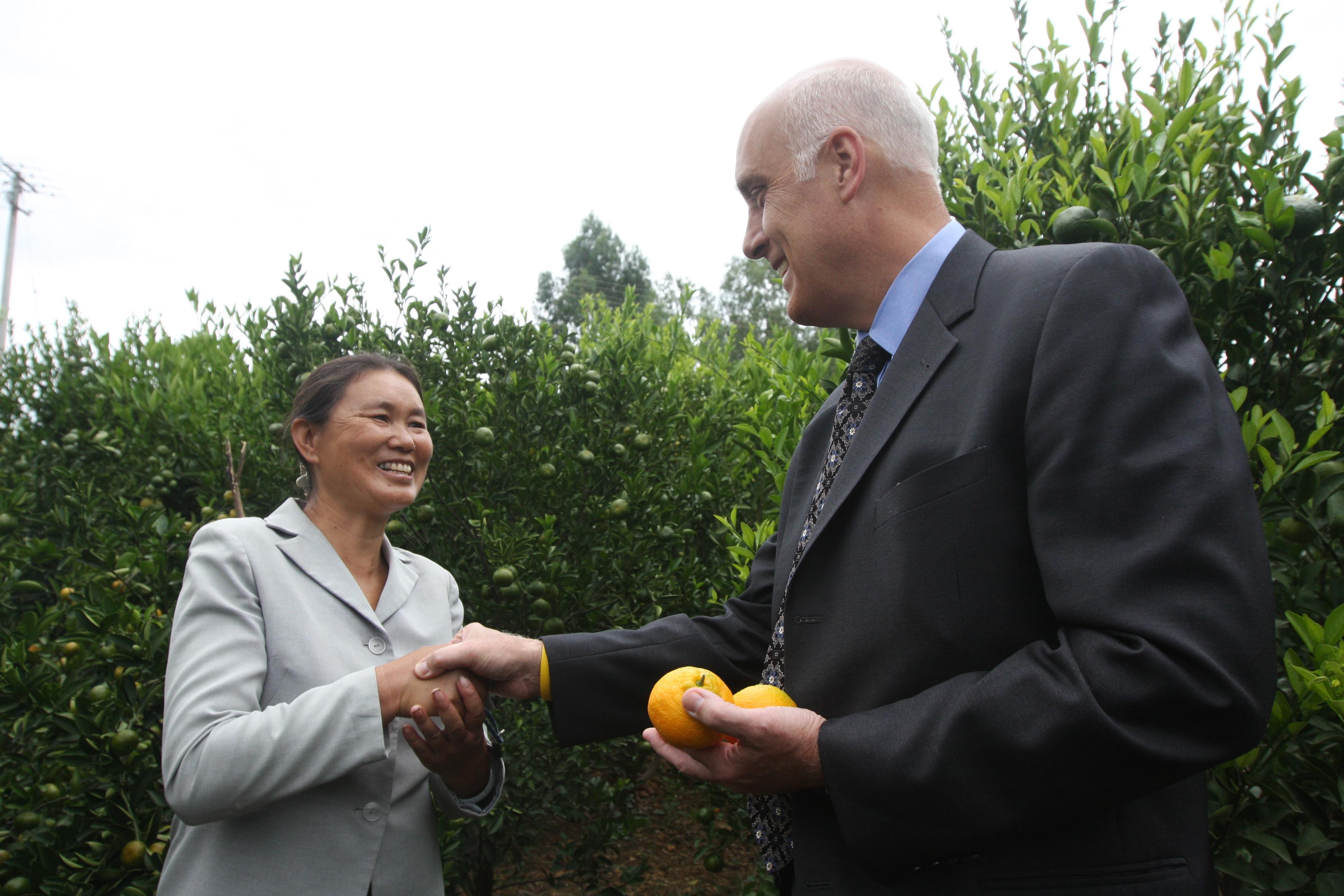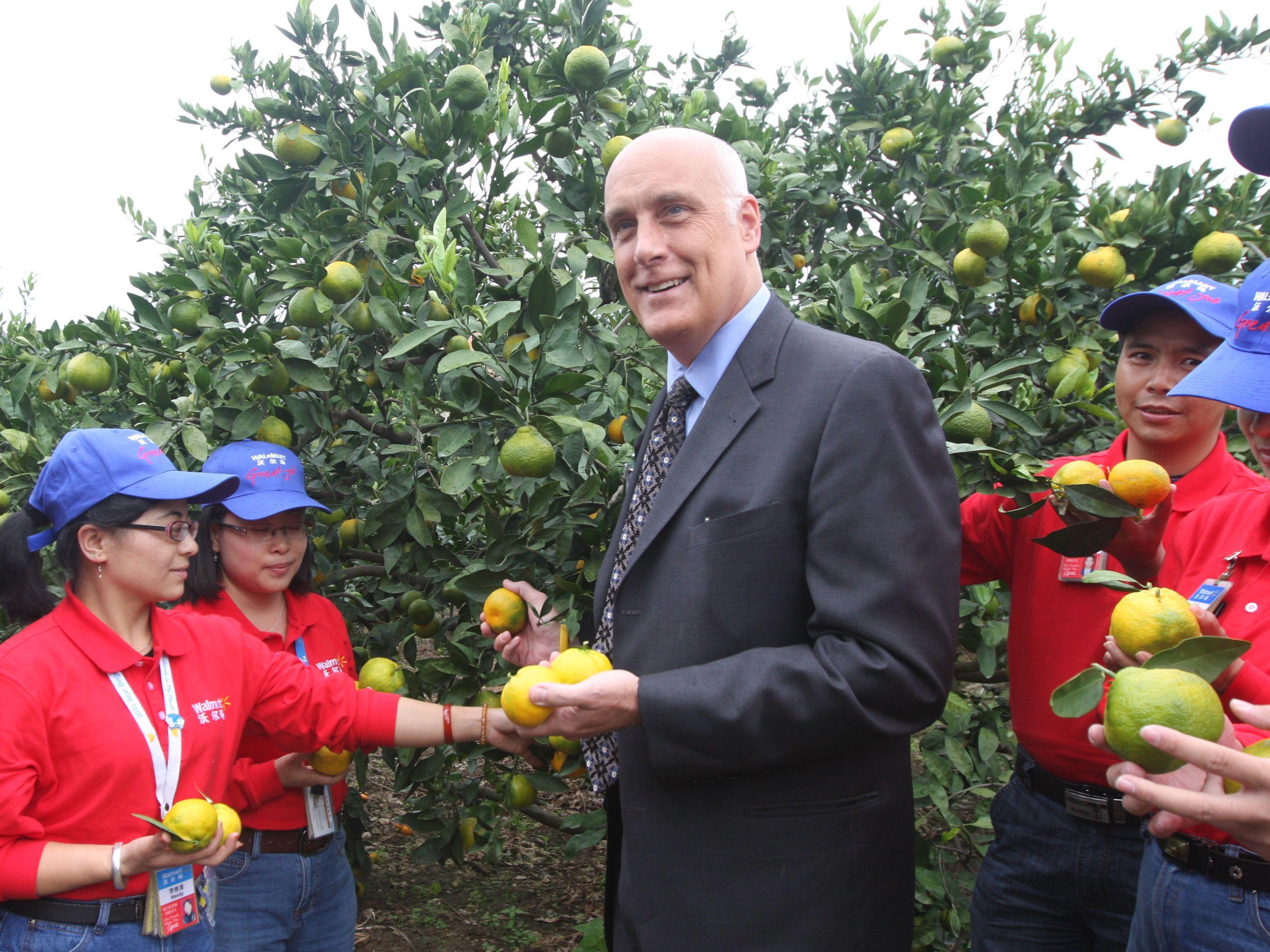 沃爾瑪中國公司事務高級副總裁博睿(中)考察大理項目基地,并同沃爾瑪員工志愿者一起幫助受助農戶收獲成熟的柑橘。