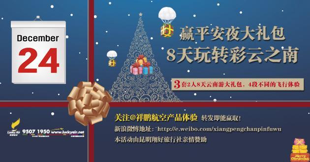 云南祥鵬航空@祥鵬航空產品體驗微博12月3日期開展微博活動,將在平安夜送出3套2人8天7夜的云南旅行大禮包。