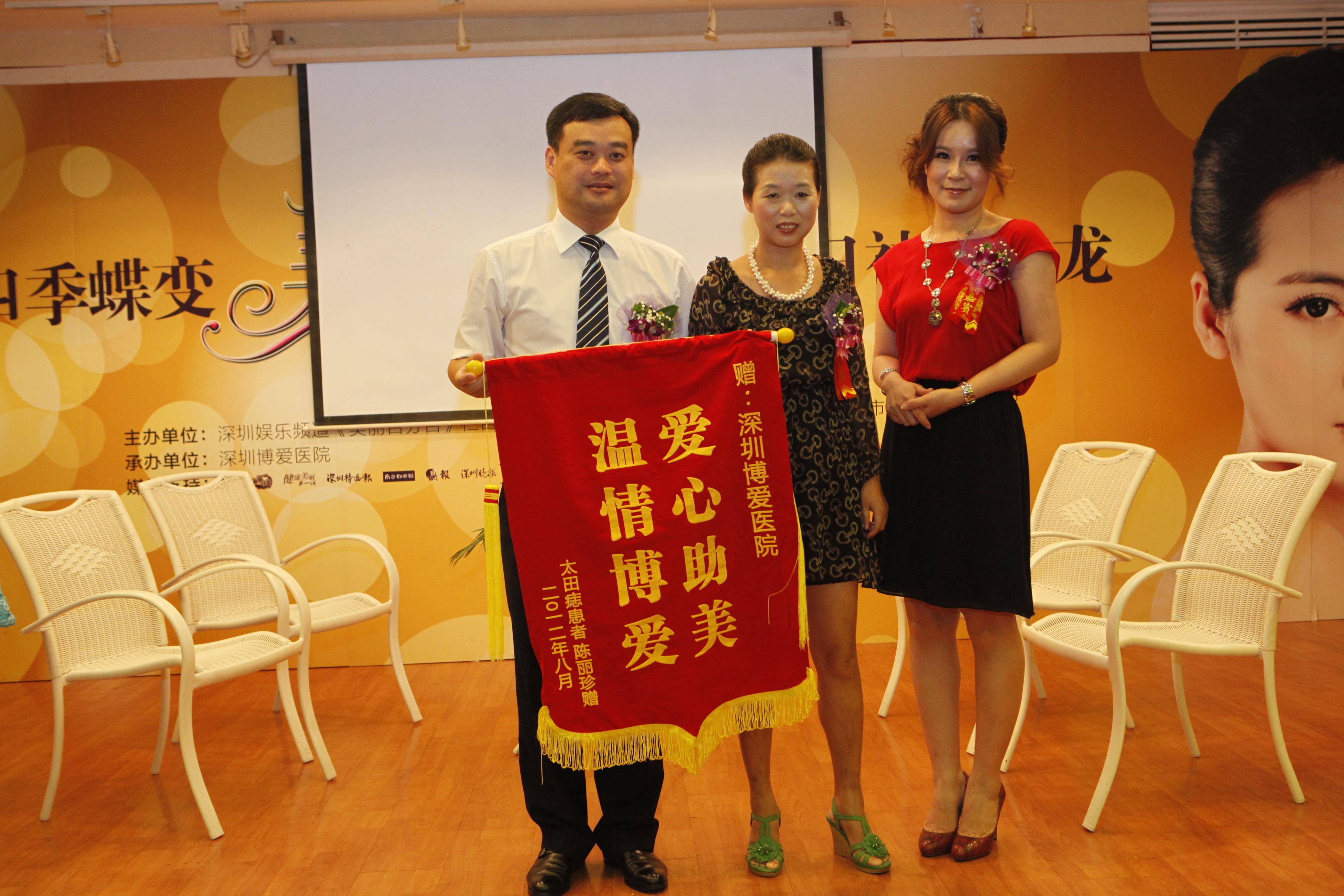 在參加8月12日由深圳電視臺《美麗百分百》欄目舉辦的“第四季蝶變·美麗百分百夏日祛斑沙龍”上,“勵志媽媽”在當(dāng)天活動現(xiàn)場為深圳博愛醫(yī)院送上了“愛心助美,溫情博愛”的錦旗,以此表達(dá)感謝之情。