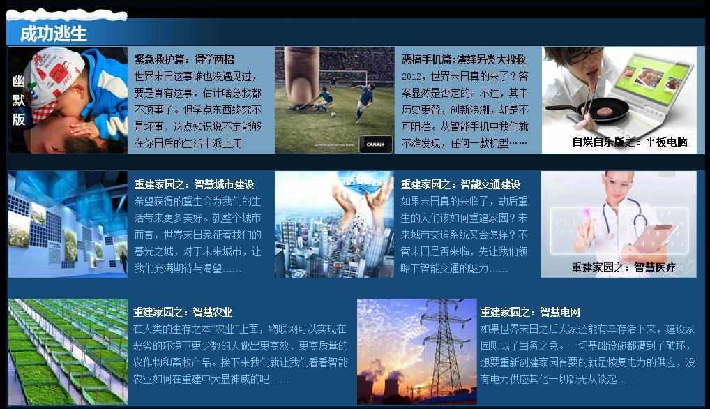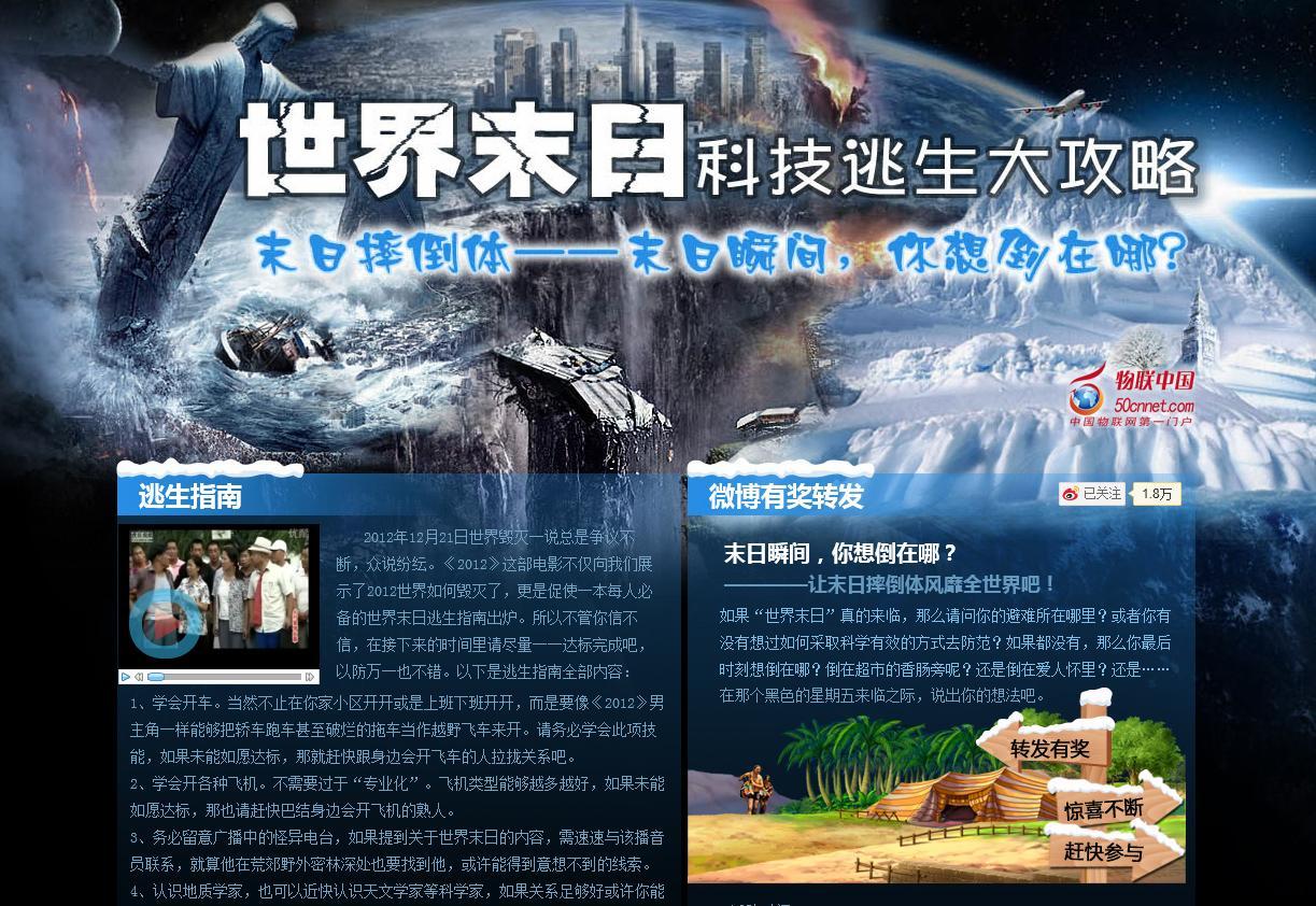 物聯(lián)中國“世界末日科技逃生大攻略”專題主要分為“逃生指南、必備清單、微博有獎轉(zhuǎn)發(fā)、制高點、避難所、諾亞方舟、成功逃生、重建家園、未發(fā)生災(zāi)難、網(wǎng)友互動”十大版塊,內(nèi)容只能以“各種搞笑”來形容。