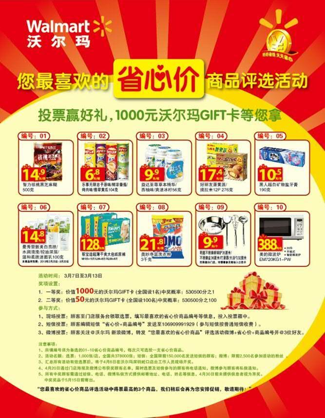 深圳2013年3月7日電 /美通社/ -- 繼去年11月,全國范圍的沃爾瑪購物廣場及好又多門店推出“上千種省心價商品如您所需”的活動后,3月7日起,沃爾瑪再次推出上千種“省心價”商品,包括食品、日用品、家庭用品等品類。同時,3月7日至13日,沃爾瑪邀請顧客參與“您最喜歡的省心價商品評選活動”,顧客通過在門店填寫選票、發(fā)送短信、轉(zhuǎn)發(fā)微博的方式,在10個備選商品中為自己心儀的“省心價”商品投上一票,就可參加幸運(yùn)抽獎,贏取面值1000元的沃爾瑪 GIFT 卡。獲得顧客投票數(shù)最多的前3名“省心價”商品,沃爾瑪還會為顧客提供后續(xù)的促銷。