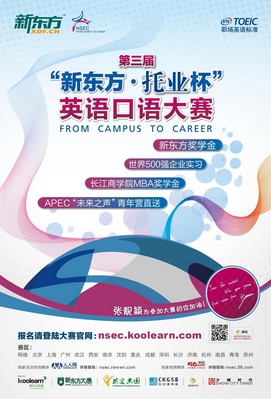 第三屆“新東方·托業(yè)杯”是以就業(yè)為主題的大學(xué)生英語口語大賽,立足于“實(shí)用、大眾、創(chuàng)新”,希望以此幫助大學(xué)生開拓英語學(xué)習(xí)思路、改善英語學(xué)習(xí)習(xí)慣、豐富英語學(xué)習(xí)途徑、提升英語實(shí)戰(zhàn)應(yīng)用,拓寬大學(xué)生的就業(yè)渠道,推動中國大學(xué)生人才發(fā)展。