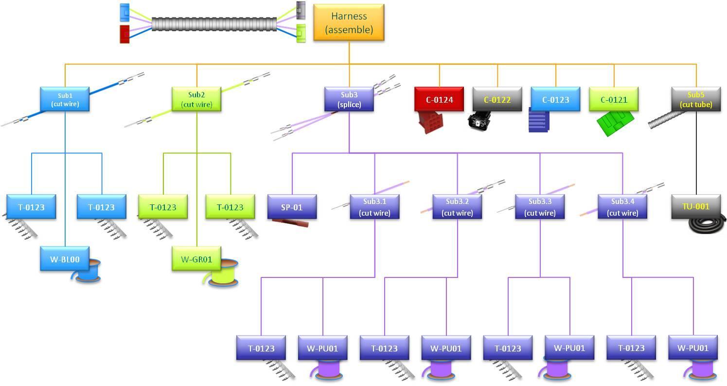 每項線束設計都可分解為一系列有序的制作步驟進行,每個步驟都會使用到組件或子組件,并產生新的子組件,直到線束制作完成。物料結構清單便是該分解分析的一項重要結果,它能夠反映有序過程,與那些只需要根據線束設計就可以計算出來的沒有層次結構的物料清單有著明顯的區別。圖1為簡單線束的分層原理示意圖。