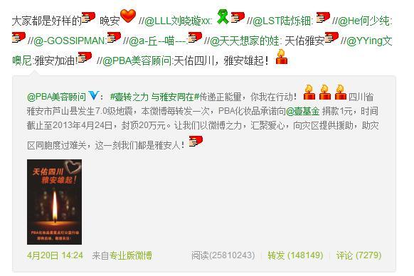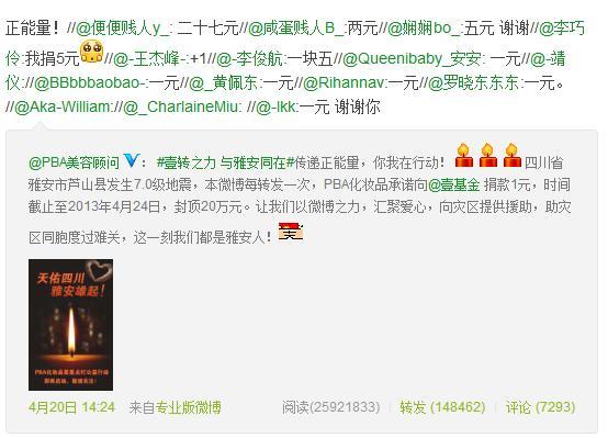 PBA充分發揮自身互聯網企業的特點,立即啟動#壹轉之力 與雅安同在#微博愛心籌款活動,號召網友傳遞正能量,匯聚愛心,向災區提供援助,助災區同胞度過難關。