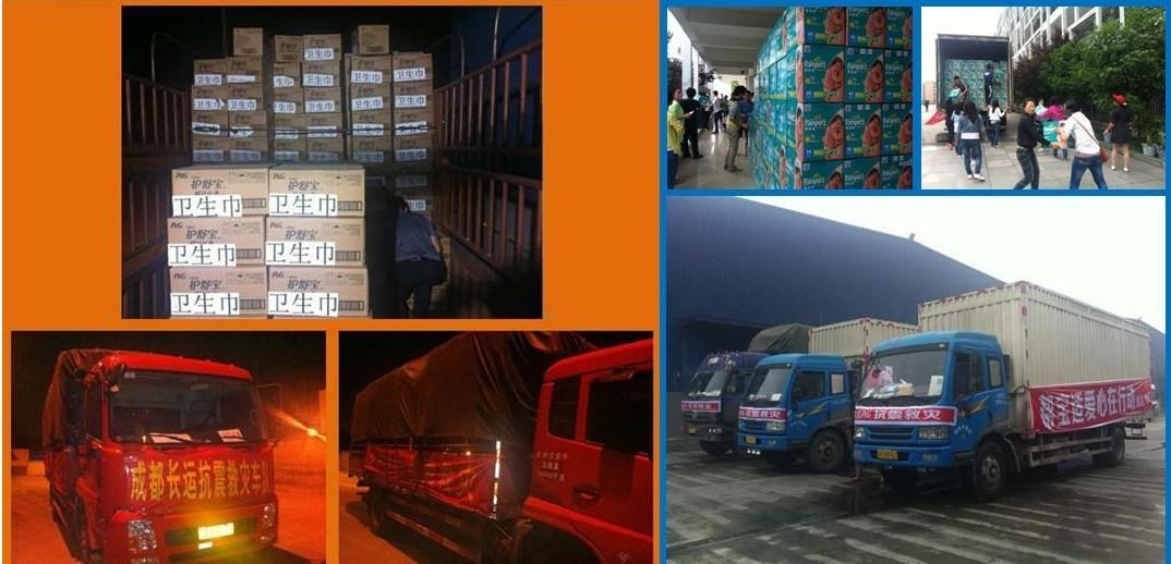 寶潔旗下品牌護舒寶,幫寶適,汰漬,金霸王及舒膚佳均在地震發生當天就緊急行動起來,調配馳援災區急需的衛生巾,紙尿褲,電池,香皂,洗衣粉等產品價值超過355萬元。在幾家公益組織包括中國婦女發展基金會、四川省婦聯、四川民政廳、中國慈善總會、雅安慈善總會、中國兒童發展基金會和壹基金的鼎力支持和協同作業下,10萬包護舒寶,50萬片幫寶適,4000箱汰漬,20萬粒金霸王電池和10多萬塊舒膚佳除菌香皂已經陸續運抵災區。