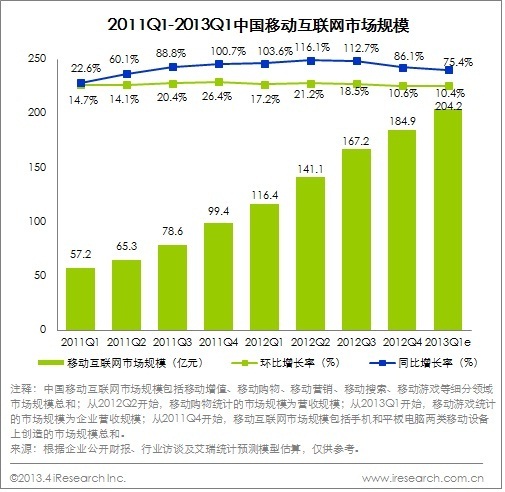 北京2013年5月16日電 /美通社/ -- 根據艾瑞咨詢統計數據顯示,2013Q1中國移動互聯網市場規模為204.2億元,同比增長75.4%,環比增長10.4%。經過過去兩年的高速增長,移動互聯網在盈利模式、產業格局等方面進入關鍵性的一年。