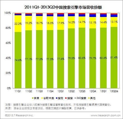 2013Q2中國搜索引擎各運(yùn)營商中,百度當(dāng)前占比81.4%,較上季度略有上升。谷歌占比14.4%。搜狗占比3.3%,搜搜占比1.3%,與上季度基本持平。360搜索 Q2 營收占比0.8%。