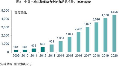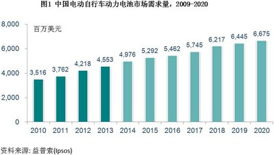 益普索(Ipsos)在發(fā)布的《中國電動車及電動車動力電池市場及行業(yè)分析》研究報告中稱,由于政府鼓勵使用替代能源減小對石油的依賴性,受環(huán)境友好型電動汽車制造商強(qiáng)勁需求的推動,電池產(chǎn)品市場在2013年至2020年間有望取得12%的復(fù)合年增長率。益普索(Ipsos)數(shù)據(jù)顯示據(jù)預(yù)測,電池產(chǎn)品總銷售額將于2020年達(dá)到112億美元,較2012年的約52億美元翻了一倍多。益普索咨詢(Ipsos Business Consulting)北京負(fù)責(zé)人崔曉波點評稱,“得益于巨大的電動自行車保有量及農(nóng)村地區(qū)電動三輪車市場的不斷增長,到2020年,中國對電池產(chǎn)品的需求將飛速上升。”