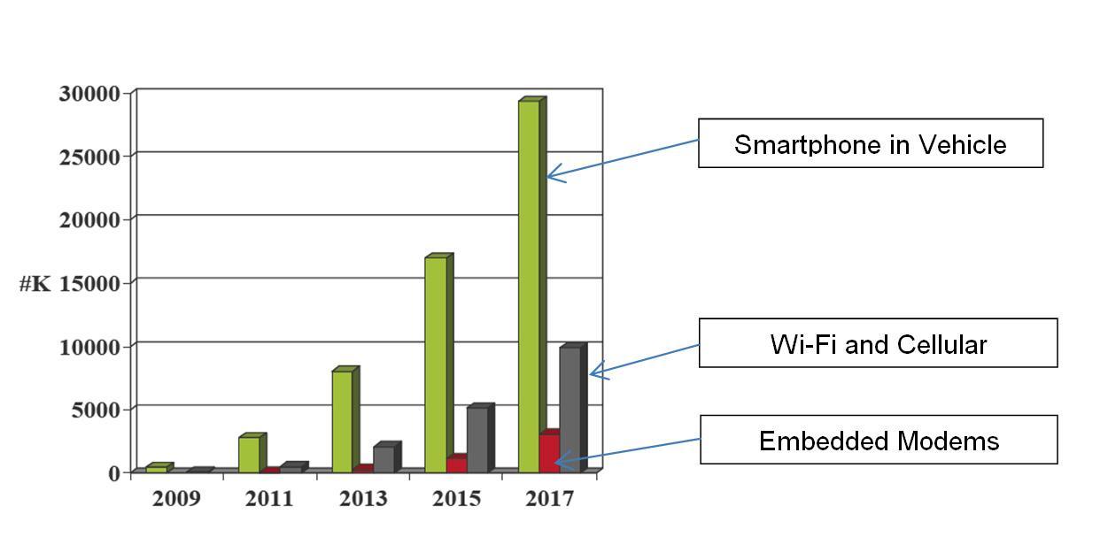 與當今手機極為相似的是,“永久性”聯網汽車將迎來令人振奮的用戶/車輛互動性。有很多種方法可以讓聯網汽車成為現實。其中一個解決方案是將智能手機嵌入汽車儀表盤和中控臺,但還是會受到限制。主要是因為手機網絡共享很難適應許多預期的車載信息需求。