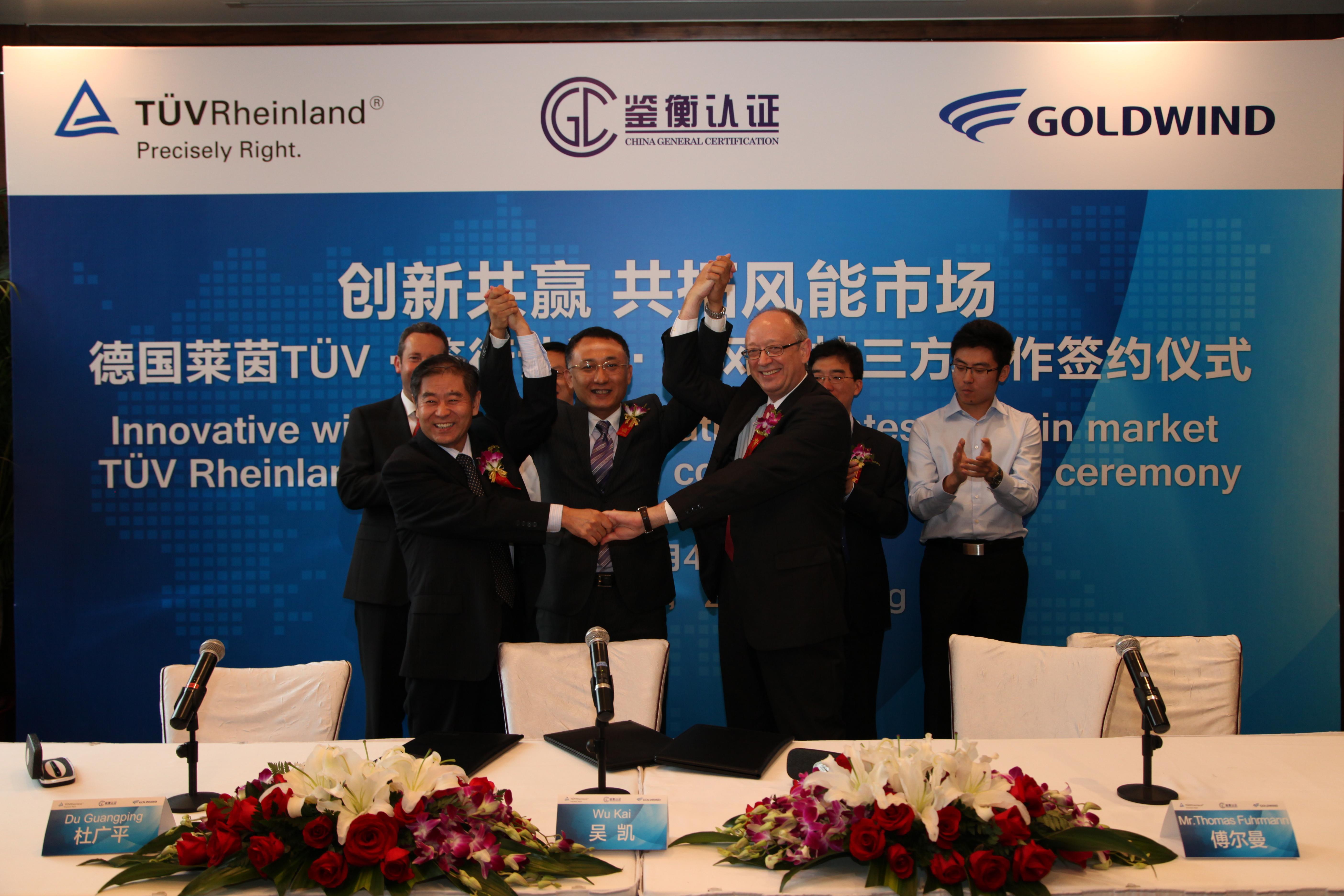 北京2013年9月5日電 /美通社/ -- 2013年9月4日,德國萊茵TUV集團(以下簡稱“萊茵TUV”)牽手北京鑒衡認證中心(以下簡稱“鑒衡認證”)與新疆金風科技股份有限公司(以下簡稱“金風科技”)在京共同簽署風電機組認證委托協議。國家可再生能源中心主任助理趙勇強、德國萊茵TUV工業服務全球總裁韓伯格、鑒衡認證中心主任秦海巖、金風科技副總裁、研發業務單元總經理吳凱等出席簽字儀式。