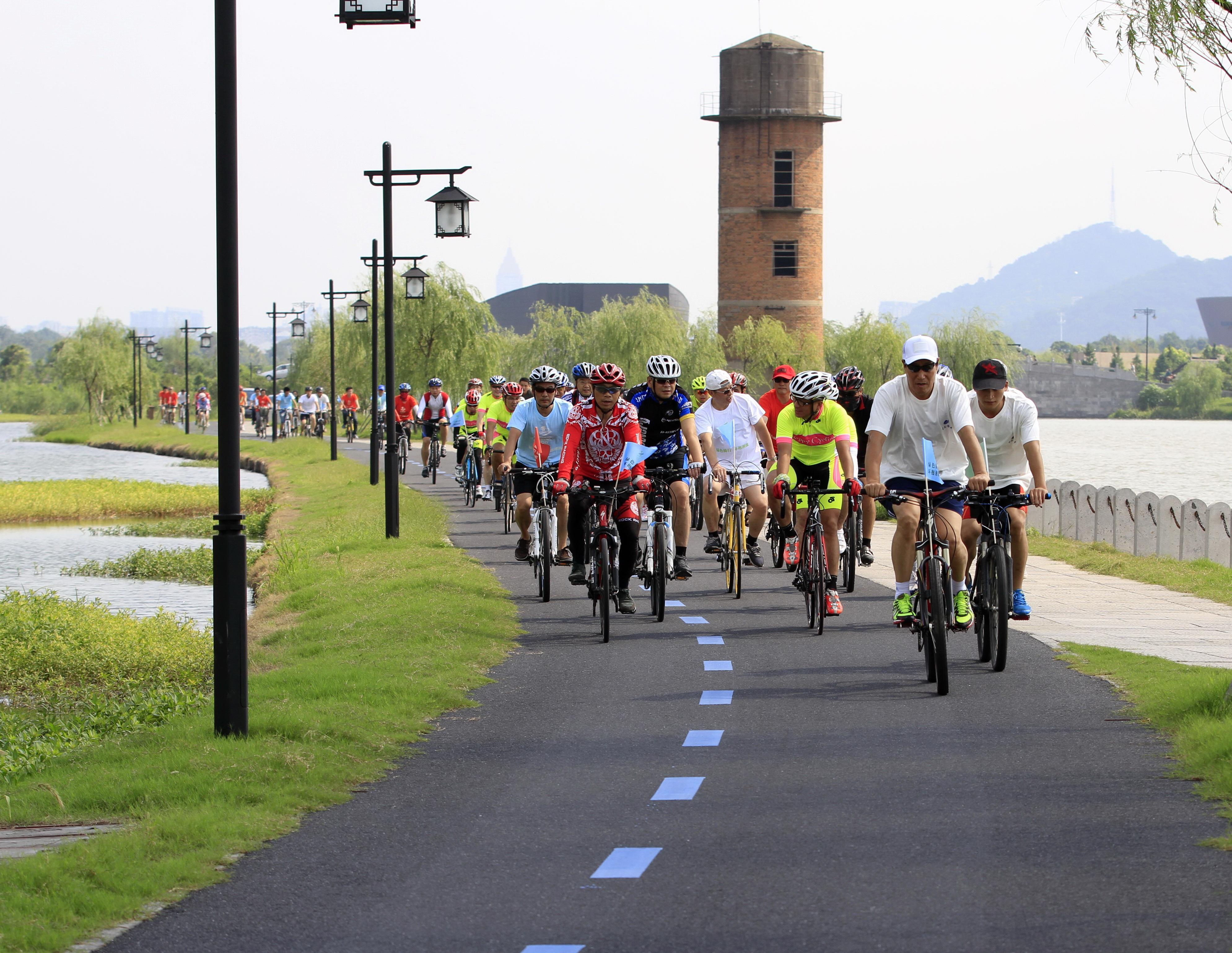 陳妙林董事長領騎著蕭山地區的騎行隊伍在湘湖環湖自行車道