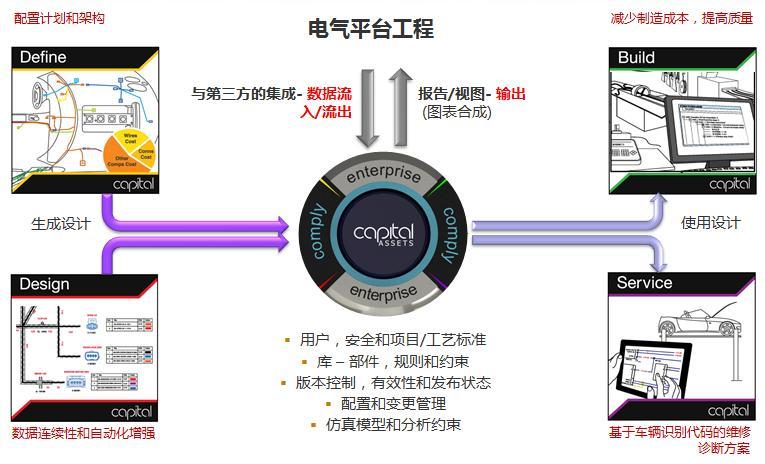 Capital 等工具使各個組織能從概念到制造與服務實現“V 模式系統”轉變,從而利用平臺進行電氣數據管理。電氣設計數據能以更加可控的方式創建并加以管理,而其自動化和驗證為各步驟的電氣設計活動提供支持。Capital 可與其它企業系統進行整合,從而發揮 ePLM 系統的作用,對日?!斑M行中”和“發布”各個層面電氣設計數據進行管理,滿足企業主系統生成與存檔的需求。