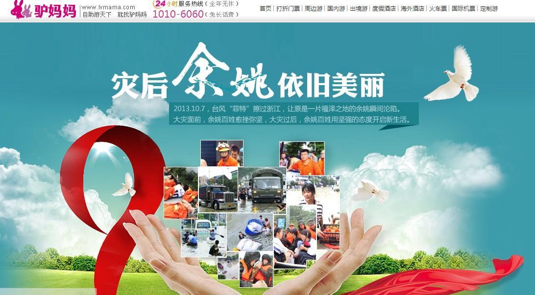 上海2013年11月1日電 /美通社/ --近日,驢媽媽旅游網攜手余姚旅游局,為重振余姚災后旅游市場特別推出“災后余姚、依舊美麗”活動,通過開展余姚實地踩線、許愿祈福等系列旅游公益活動,重聚余姚旅游人氣,全力支持余姚的災后重建。