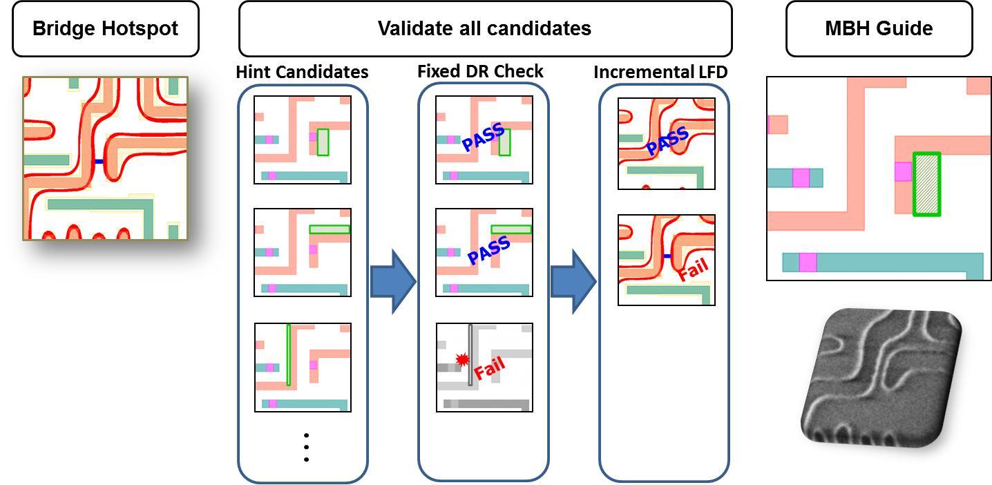在明導(dǎo),我們稱(chēng)之為基于模型的建議(MBH)。MBH 可以評(píng)估熱點(diǎn)、確定有哪種修復(fù)選擇可以使用、進(jìn)行模擬來(lái)確定這些修復(fù)建議也遵守所需的條件,然后為設(shè)計(jì)人員提供適當(dāng)?shù)男迯?fù)建議(圖1)。一次修復(fù)可能包括單邊移動(dòng)或者多邊移動(dòng),一個(gè)光刻熱點(diǎn)可能存在不止一種可行的修復(fù)方法。此外,修復(fù)后的設(shè)計(jì)驗(yàn)證可以發(fā)現(xiàn)任何新的違反DRC最小線寬寬度或者間隔的狀況,但是它無(wú)法檢測(cè)到被刪除或者合并的多邊形,因此 MBH 系統(tǒng)必須將這個(gè)知識(shí)整合進(jìn)建議模型所提供的建議里。能夠在一個(gè)建議里看到所有可行的修復(fù)選擇,使設(shè)計(jì)人員同時(shí)擁有糾正熱點(diǎn)所需的信息以及進(jìn)行最適合其設(shè)計(jì)修復(fù)的靈活性。